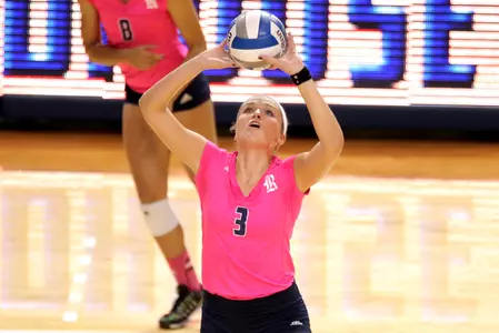 Rice was led offensively by senior right side hitter Chelsey Harris, who posted a team-high 11 kills (.391) while junior setter Madison McDaniel achieved her 17th double-double of the year with 26 assists and 10 digs.